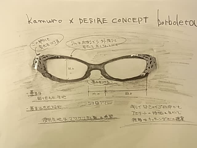 フロントがメタルのこのデザインにアセテートを使いサイズ感を大きくして男性モデルで作れたら面白いのではないか!?